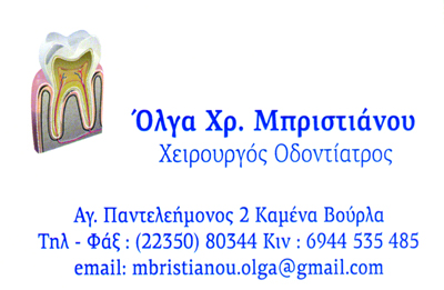 customer tabsΕπικοινωνίαΔέχεται καθημερινά πρωί & απόγευμα με ραντεβούΧειρουργοί ΟδοντίατροιΥγείαΑγίου Παντελεήμονος 2, Καμένα ΒούρλαΚΑΜΕΝΑ ΒΟΥΡΛΑ ΦΘΙΩΤΙΔΑΣΦΘΙΩΤΙΔΑΣΤΕΡΕΑ ΕΛΛΑΔΑ 2235080344 6944535485mbristianou.olga@gmail.com Το προτείνω (έχει προταθεί 0 φορές) ΦωτογραφίεςFacebook LikeShare on FacebookTweet Widget